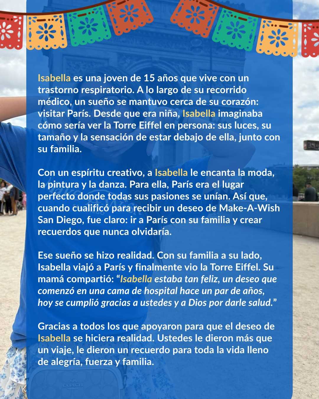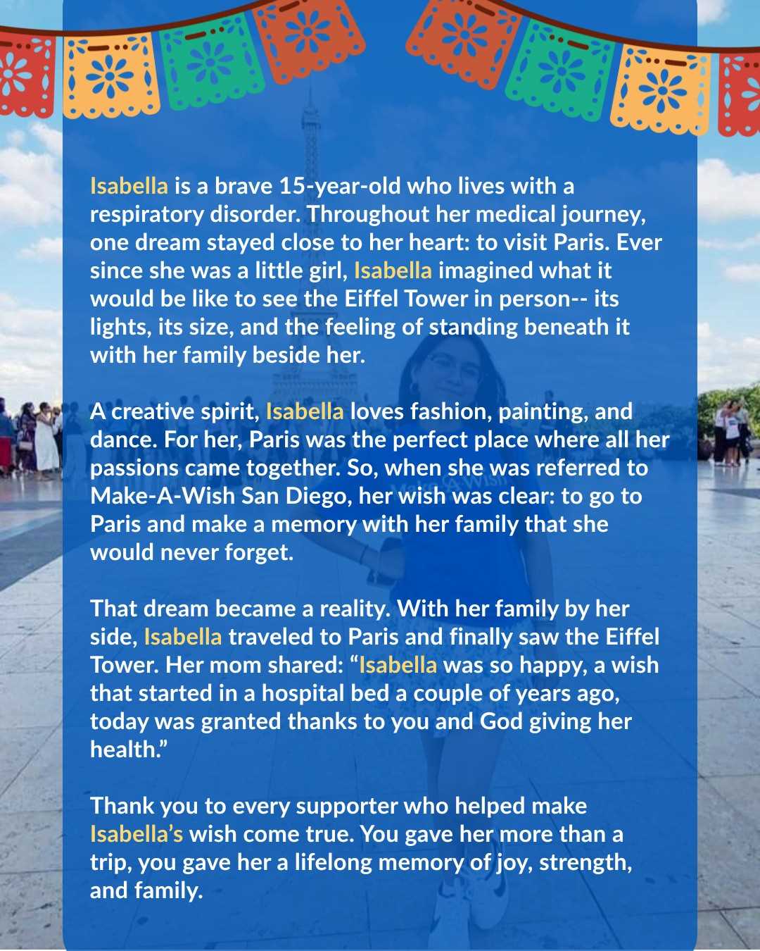 . Inspired by her love of fashion, painting and dance, Isabella wished to see the Eiffel Tower with her family—and she did.
