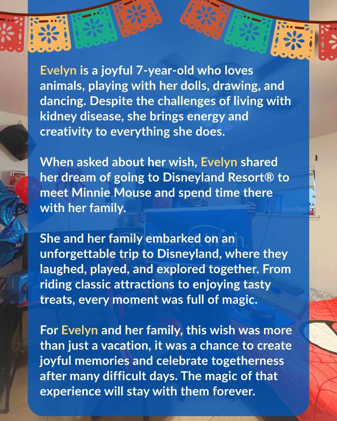 ?Meet Evelyn, a joyful 7-year-old who loves animals, playing with her dolls, drawing, and dancing—her creativity shines despite the challenges of living with kidney disease. When her wish to visit Disneyland Resort® came true, Evelyn and her family shared an unforgettable adventure filled with laughter, magical moments, and the joy of meeting Minnie Mouse????!