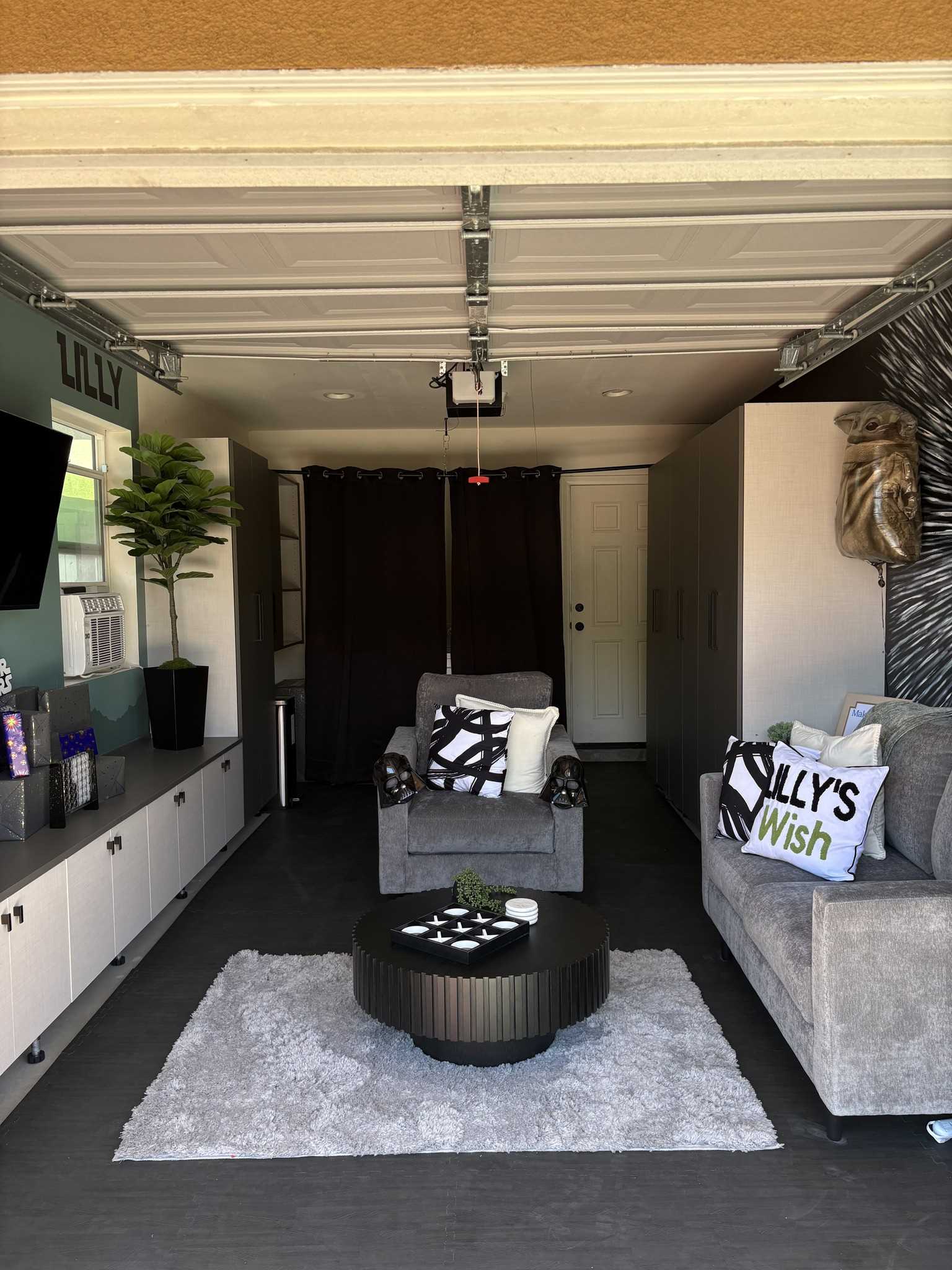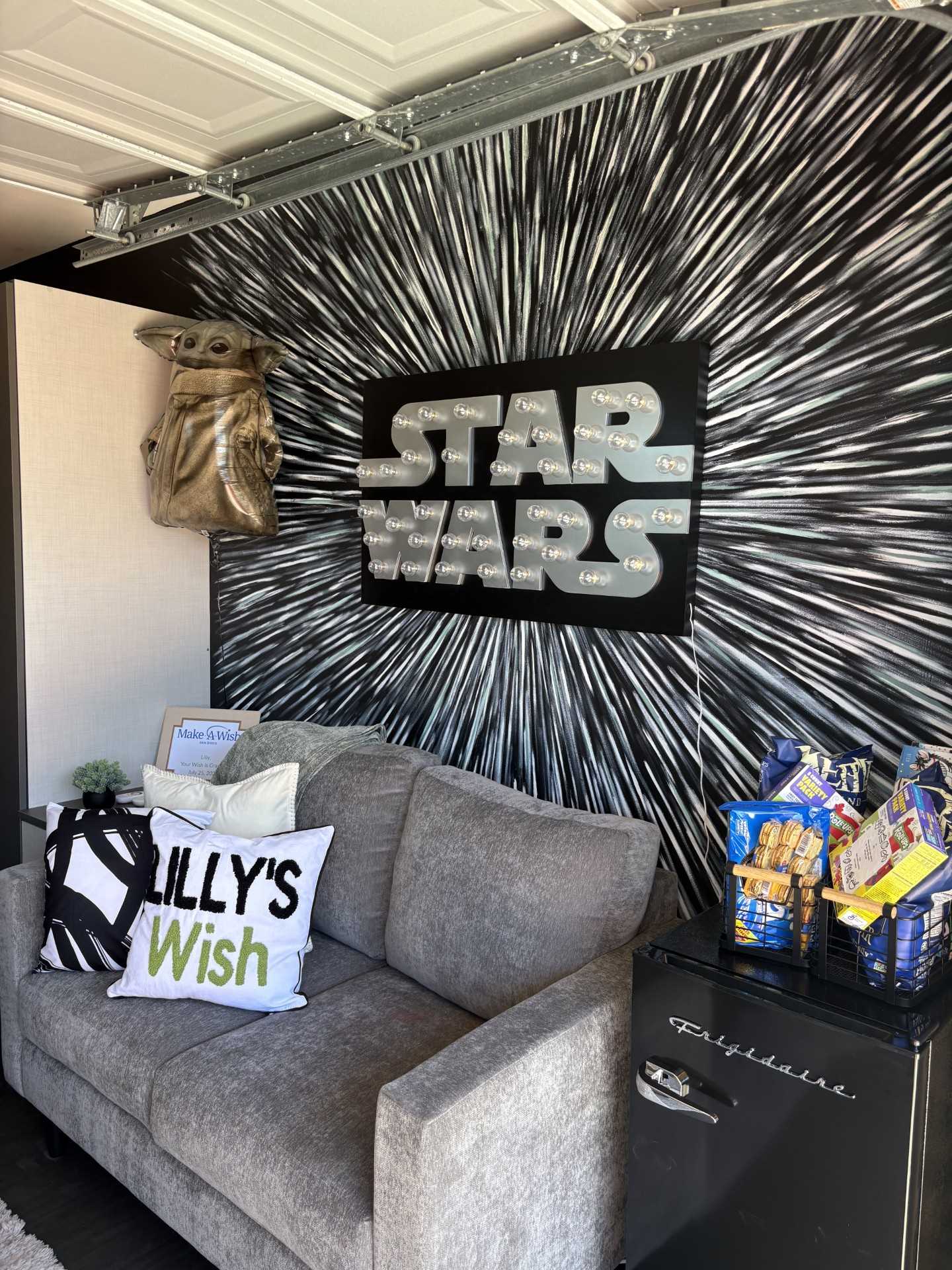 Lily's had dreamed of a space all her own... a place to hang out, play games, watch videos, and spend time with friends. With Closet Factory’s & The Mural Clubs help, her garage was transformed into the ultimate Star Wars-themed hangout, complete with furniture, shelves, games, and video equipment.